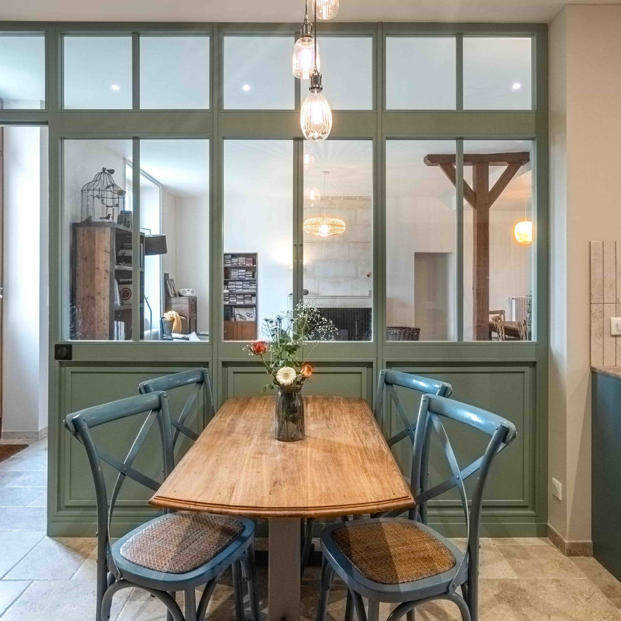 Le projet vise à repenser l’espace du séjour en intégrant une cuisine fermée, séparée par une verrière élégante qui laisse passer la lumière naturelle tout en préservant la visibilité depuis le salon. Les zones salon et salle à manger se distinguent grâce au jeu de la décoration, des éclairages et des variations de hauteur sous plafond. La mise en avant de matériaux naturels tels que le bois, la pierre et l’osier constitue l’atout majeur de cette maison de campagne.